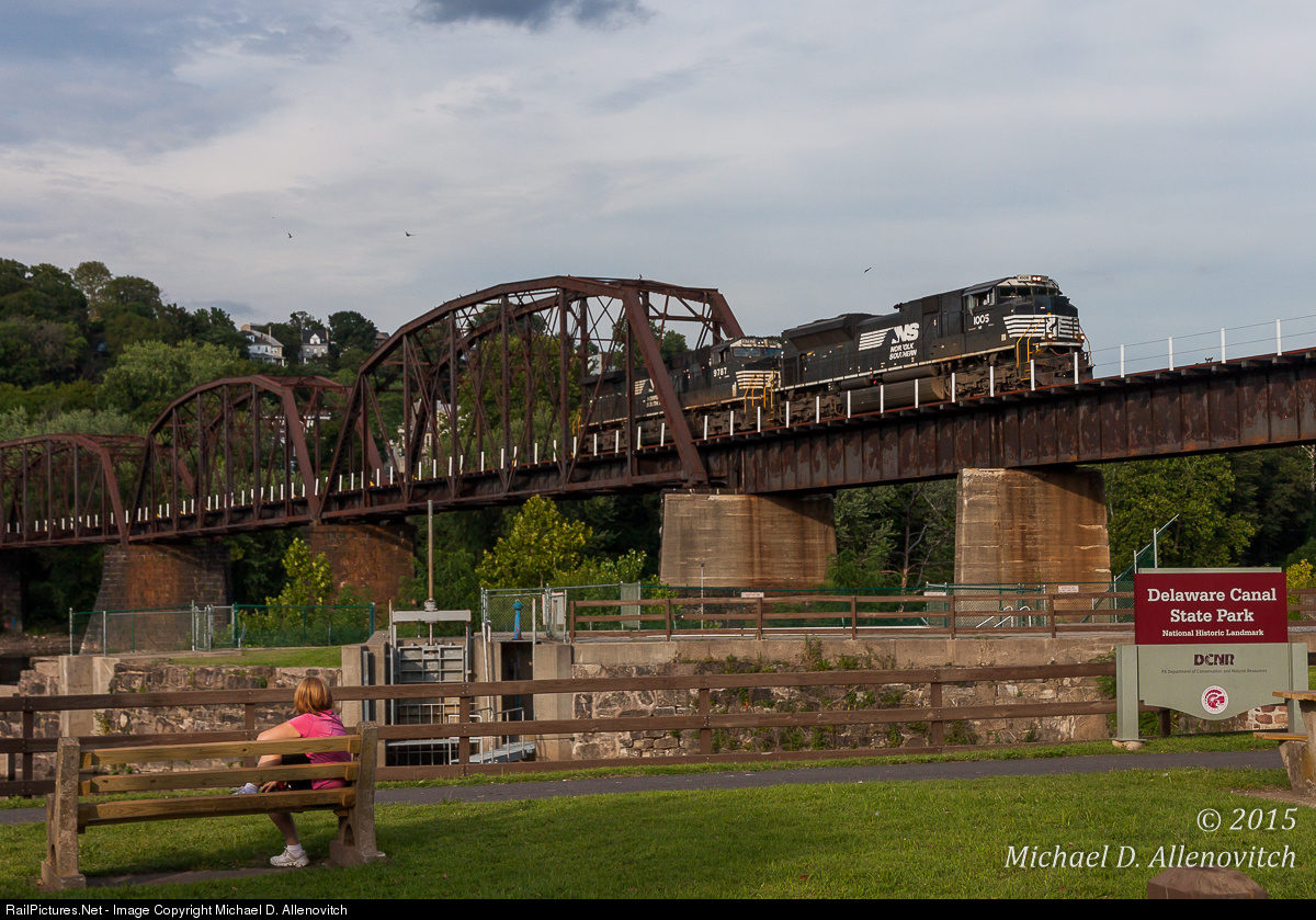| Norfolk Southern Local H76 crosses the old Lehigh & Hudson bridge in Easton, PA after dropping its set of cars in Hudson Yard in Phillipsburg, NJ. This train just made a round trip to Portland, PA where it interchanged cars with the Delaware-Lackawanna Railroad. |