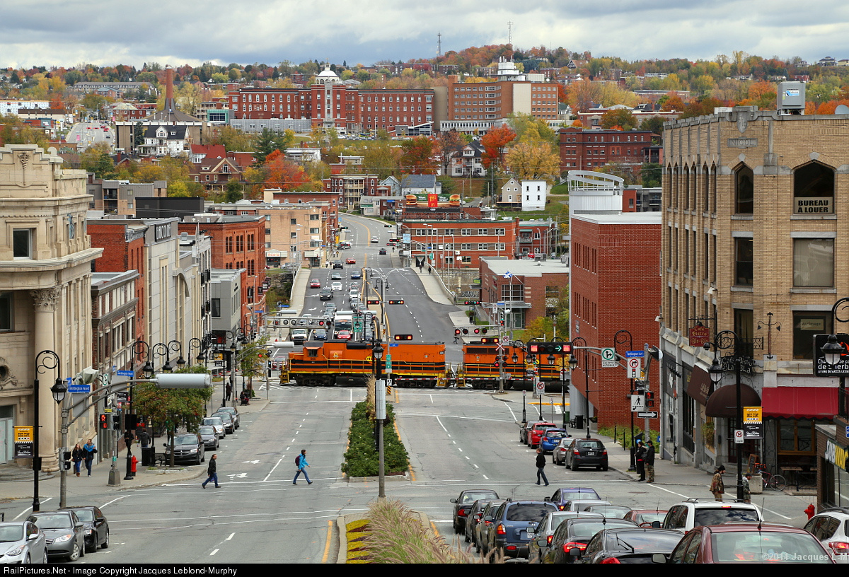 Looking down King Street in Sherbrooke, westbound train 393 threads its way through the city on its way to the CN interchange in Richmond. The city is draped over the hillsides flanking the St-Francis River.