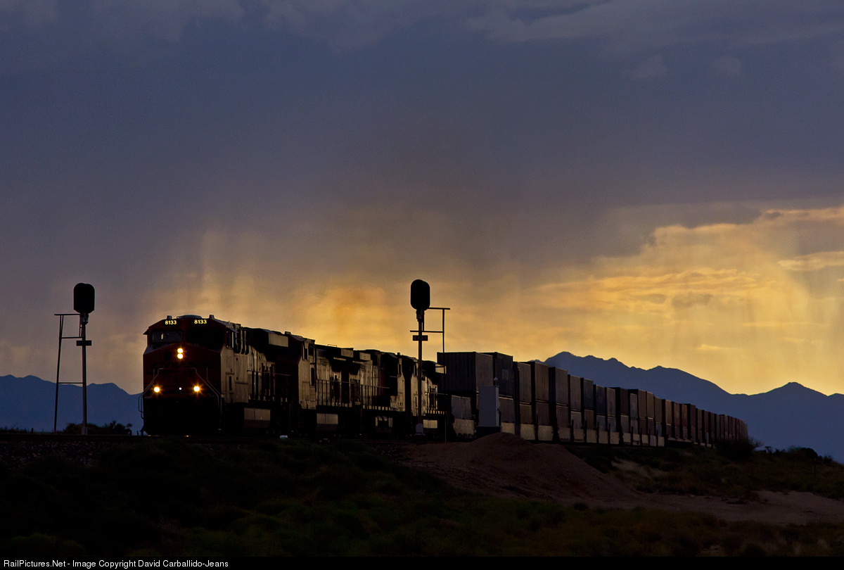 With the setting sun, a summer monsoon storm, and four General Electric locomotives working hard; the BNSF Seligman Subdivision can offer some of the most breathtaking views for rail photographers. Just west of Hackberry, along Route 66, a Long Beach, CA to Chicago, IL double-stack train can be heard long before the headlights crest the top of the sag.