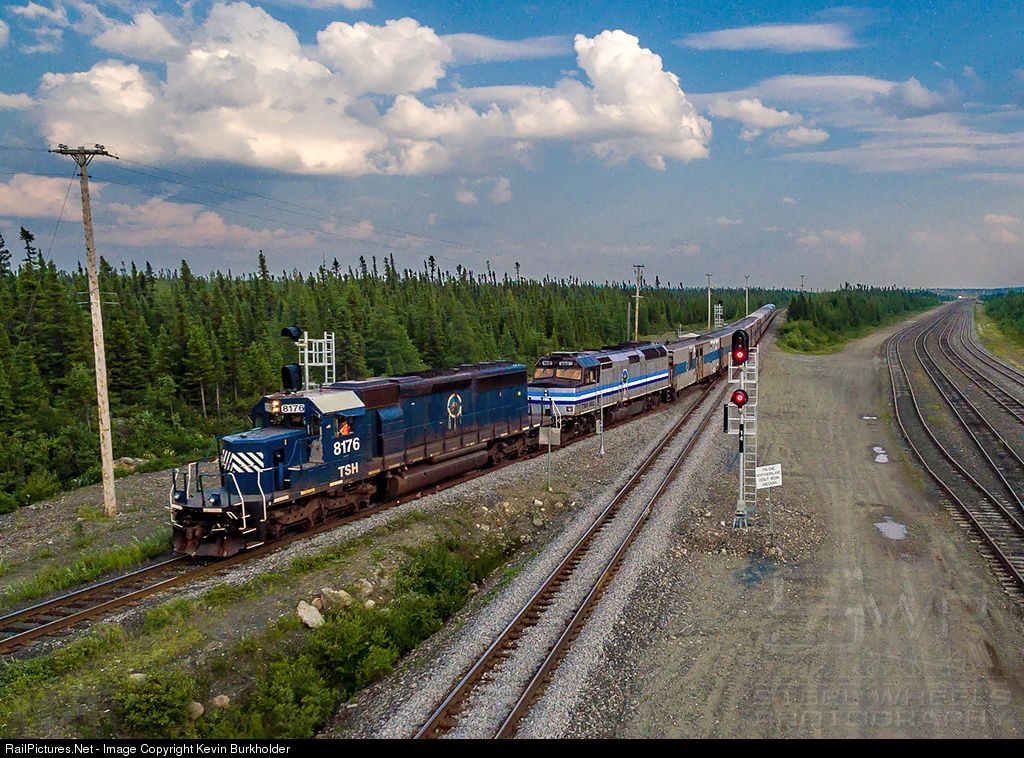 Running approximately 3 hours off the advertised arrival at Emeril station, the Tshiuetin Rail Transport Northbound Passenger train leaves Quebec, North Shore & Labrador's Waucona Subdivision and enters the TSH Subdivision on the way from Sept-Iles to Schefferville, Quebec. The train is led by "TSH" SD40-2 8127, though the crew referred to the unit as the HLCX 8127 for all radio transmissions, and F40PH 602. The train is made up of former Amtrak mail handling cars turned baggage cars and several stainless steel cars - many bearing reporting marks and faded logos of prior owners, including one with CNO&TP/Southern Railway still visible!