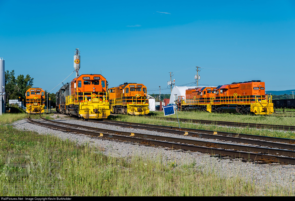 A full house at the Quebec-Gatineau Railway Henry IV yard in Quebec City on August 23, as a congregation of several EMD models is represented. From left to right - QGRY GP38 2009; QGRY SD40-3 3325, with SD40u's 6904 and 6908; QGRY RP39-2 2302 and SW1500 1504; and stored (off of the Western Labrador Rail Services) are SD40-3s 3326 and 3334.