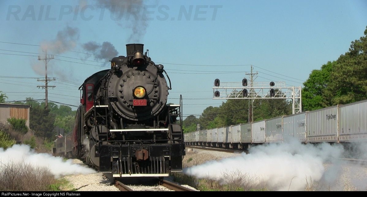 Southern 4501 waits at the TVRM NS interchange point for a triple crown train to pass by before heading out onto the NS mainline for an excursion trip.