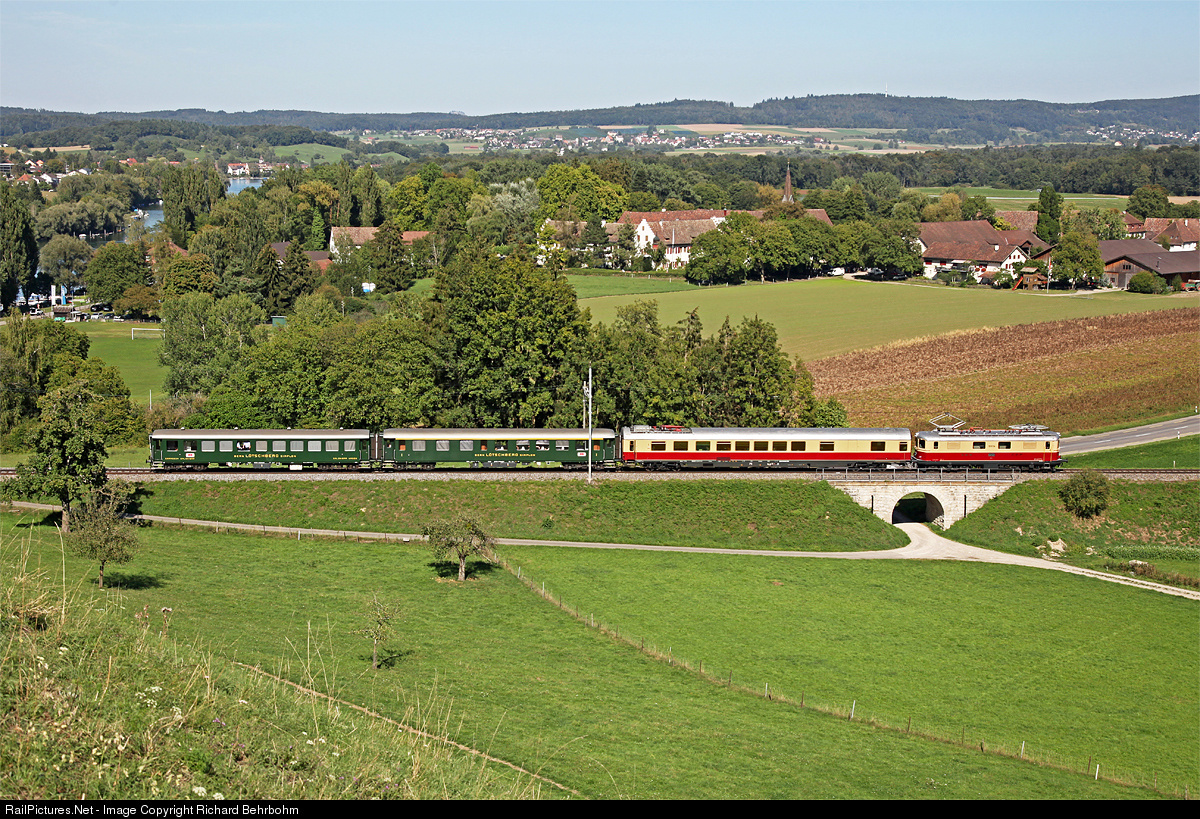 | Re 4/4 I 10034 is pulling a dining car of association "SVG (Schienenverkehrsgesellschaft) Stuttgart", Germany. Both vehicles have the famous Trans-Europ-Express colours. The green passenger cars belong to the "Swiss Classic Train". |
