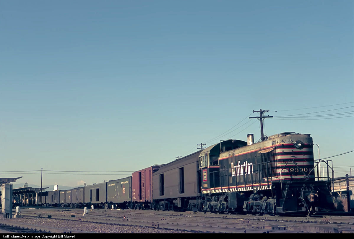 The 1968 holiday rush is already underway on November 2, as Chicago Burlington & Quncy S2 9300 drags a long cut of mail storage and express cars out of Denver Union Station. In the early 1940s as wartime traffic burgeoned, the Q, desperate for more switchers, turned to the War Production Board, which assigned it two of the 1000-hp Alco switchers. Over the following year, the Board, which oversaw manufacturing and production, diverted two more groups of S2s from Utah copper hauler Bingham & Garfield to the Q, bringing the total to nine. After the war, all found their way to Denver where they almost instantly swept steam switchers from the yards. Tough little engines, they remained the only Alco diesels Burlington ever bought, but their distinctive turbocharged sound, like running the fingers up the teeth of a comb, remained a fixture of Denver railroading until they were traded to General Electric in 1969