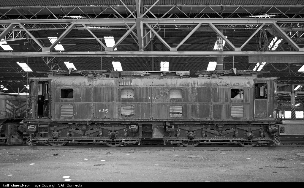 | E25 in profile. Covered in dust and in very poor condition now, E25 is one of two remaining examples of the Class 1E electric locomotive. South African Railways electric motive power history if ever there was, E25 is pictured here standing in a disused Goods Shed at Danskraal / Ladysmith. Class 1E, E25, was built in 1923 by Swiss Locomotive & Machine Works. The Class 1E locomotives were the first electric locomotives placed in service by SAR. |