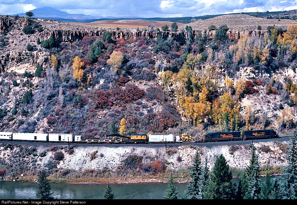 | Usually it was not a good railfanning day when one of these trains were sighted, but fortunately on Sept. 30, 1991 D&RGW SD’s 5372 and 5508 were taking the derrick train eastward back to Denver after handling derailment duties. The cumbersome and slow-working dinosaur derricks have been replaced with nimble side-boom caterpillars. Some fall colors along the Colorado River near State Bridge, Colo. |