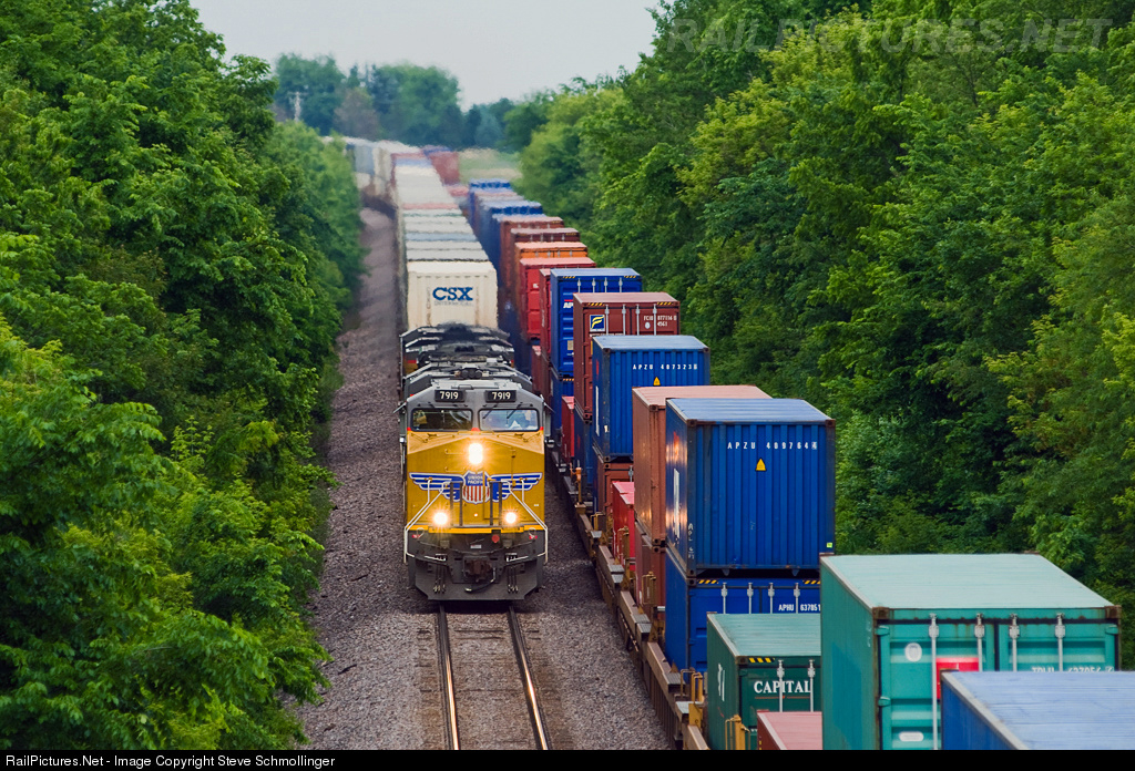 | The dispatcher runs a hot westbound stack train of domestic containers around one with marine boxes at DeWitt, IA. |