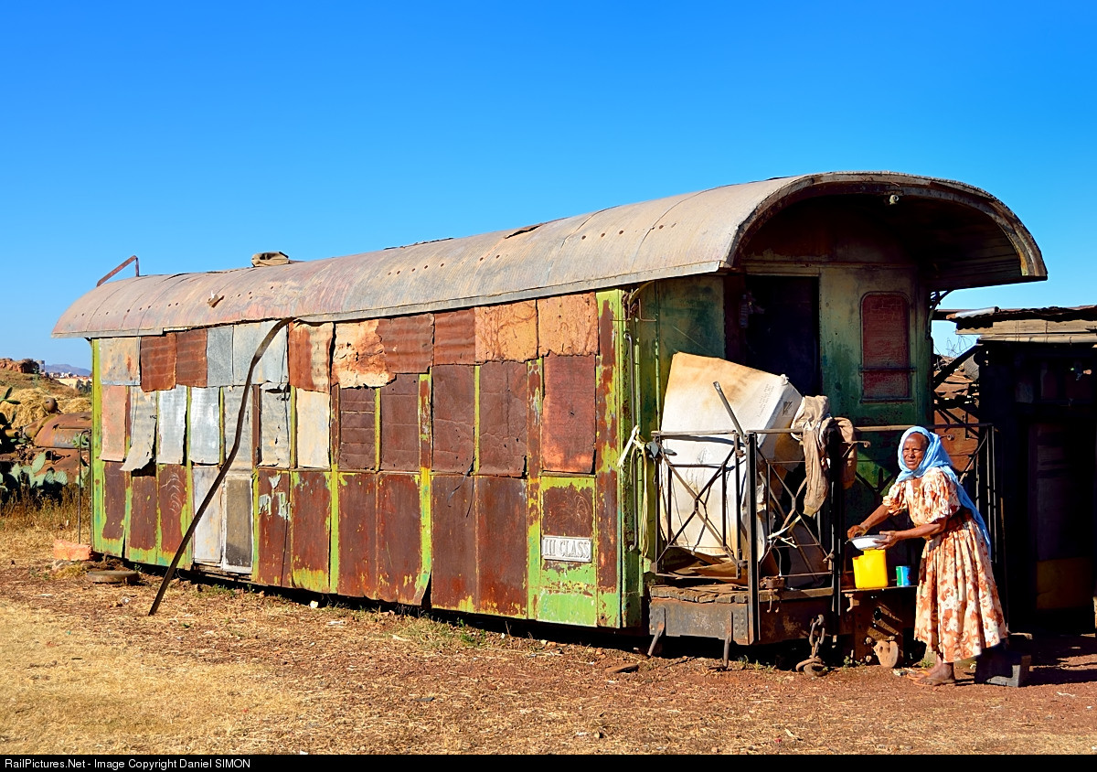 Recycling in Eritrea.Almost everything is recycled in this country. This old third class passenger car became the home of a family in the suburbs of the country capital Asmara. It is still wearing the third class plate.