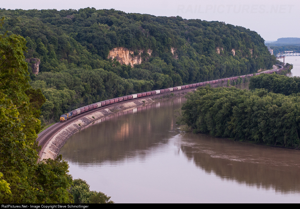 Just before sunset on a hazy evening, two big CSX GEs lead a westbound BNSF grain train along the Palisades and the Upper Mississippi River.