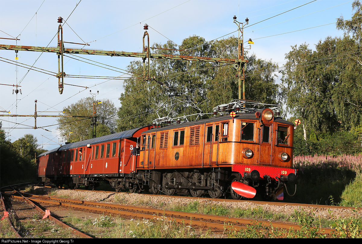 | Du # 109 of association Östra Skånes Järnvägar in Kristianstads, with a charter special from Båstad Nord over Hallandsåsen to Aengelholm, entering Grevie for a crossing with a X2000 trainset of the SJ. The 1`C 1`locomotive with rod drive was built in 1925 by ASEA and NOHAB for the Statens Järnvägar. |
