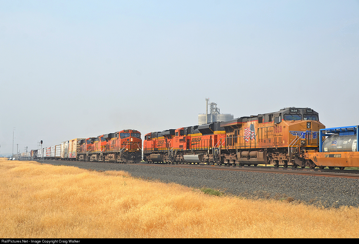 Westbound BNSF Railway train Q-CHCPTL2-20 (Guaranteed Service Intermodal; Chicago IL to Portland OR) has stopped in the siding at West Tokio to await eastbound train H-PASKCK9-24 (High Priority Merchandise; Pasco WA to Kansas City KS) - and it didn't have to wait long! Just a few minutes after stopping, the headlight of H-PASKCK9-24 lead engine (BNSF ES44DC 7826) appeared. (For the record, the westbound was powered by NSF 6136, BNSF 9371 and UP 7628, and the eastbound was led by BNSF 7826, 5030 and 7486.)