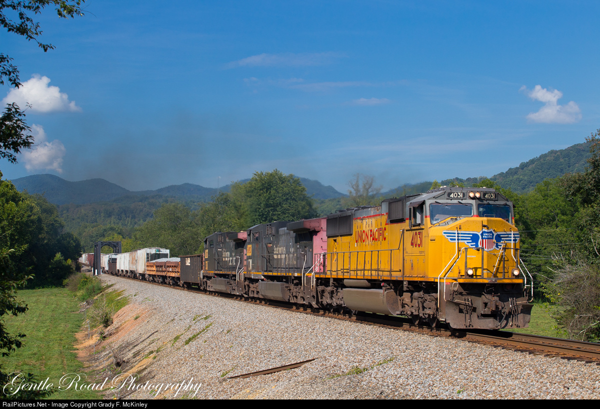 | A scene that could easily be mistaken for Northern California plays out in Old Fort, NC on this beautiful first day of September. A full UP consist, including 2 in SP paint lead NS train 162 in the shadow of the Blue Ridge. |