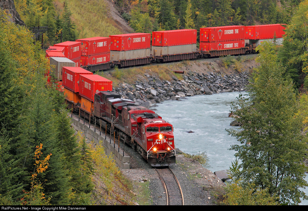 | Curving along the Kicking Horse River, a bright Canadian Pacific stack train approaches Glenogle, British Columbia, on September 22, 2013. |