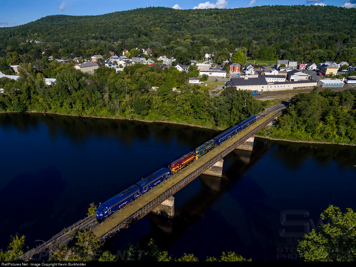 Pan Am Southern's Office Car Special train - OCS-11 - is seen with FP9As PAR-1, PAR-2, GP9s ST 77 (Boston & Maine heritage) and ST 52 (Maine Central heritage) backing onto the Connecticut River bridge from White River Junction, Vermont, toward Lebanon, New Hampshire on Friday, September 11. The train is being positioned for the 23rd Annual Glory Days of the Railroad Festival. A special thanks to Pan Am Southern for participating again in the 2015 Glory Days of the Railroad Festival in White River Jct., Vermont the weekend of September 12 and 13!