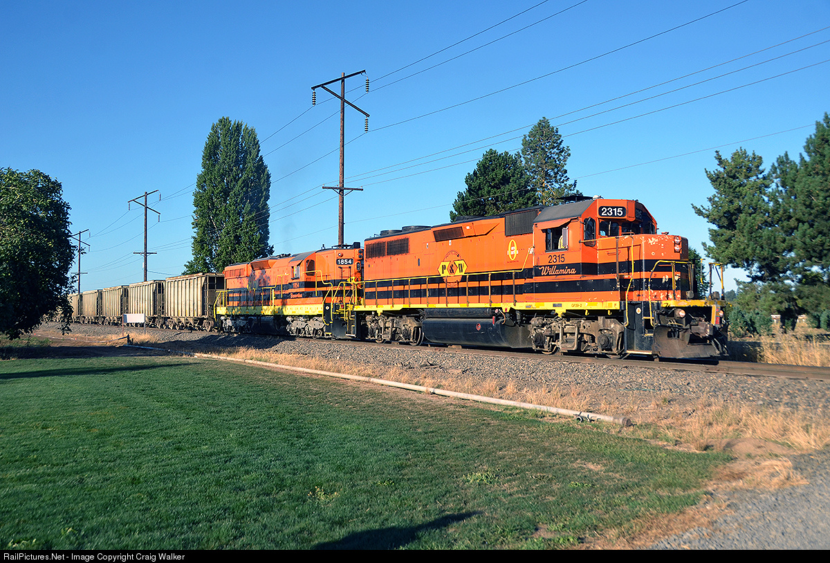 Portland & Western train 735R, a rock train, has just come out of the quarry in Hopmere, a section of Salem, Oregon, where the train originates, led by GP39-2 2303. Now on the mainline, the train is led by GP39-2 2315 ("Willamena") and SD9 1854 (with 2303 on the rear), and the train has just begun moving as it begins its trip to Hillsboro, Oregon.