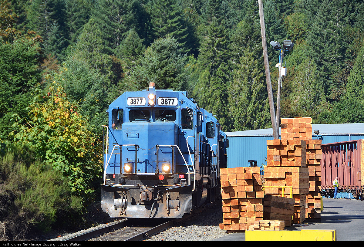 Coos Bay Rail Link's train to Eugene departs little Noti, Oregon, on August 26th, 2015. The eastbound, powered by GP38s 3877 and 3876 (formerly Southern Railway 2813 and 2796) and GP38M 3802 (ex-Baltimore & Ohio GP40 3730), the train will pick up four cars and drop three empties and depart for Eugene with 80 cars. The two former Southern Railway diesels had their high short-hoods lowered (the "scar" is visible in this shot), but retained the control stand on the left side, so the engineer sits where the fireman/conductor is normally seated, and the conductor is in the right-hand seat!