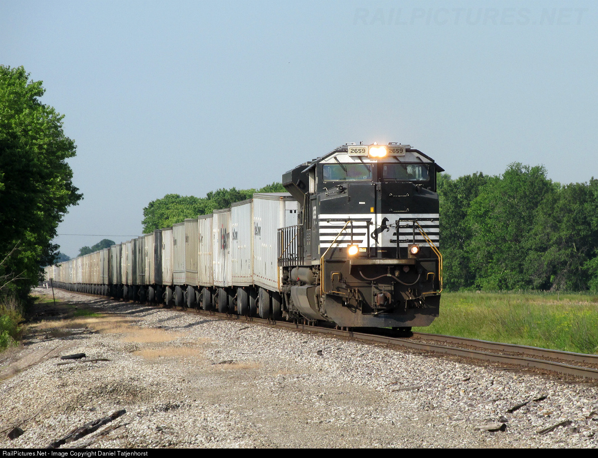 | Slowly chugging along, NS 2659 leads a long, underpowered roadrailer in rural Staunton on it's way to Decatur, IL and ultimately Detroit, MI. |