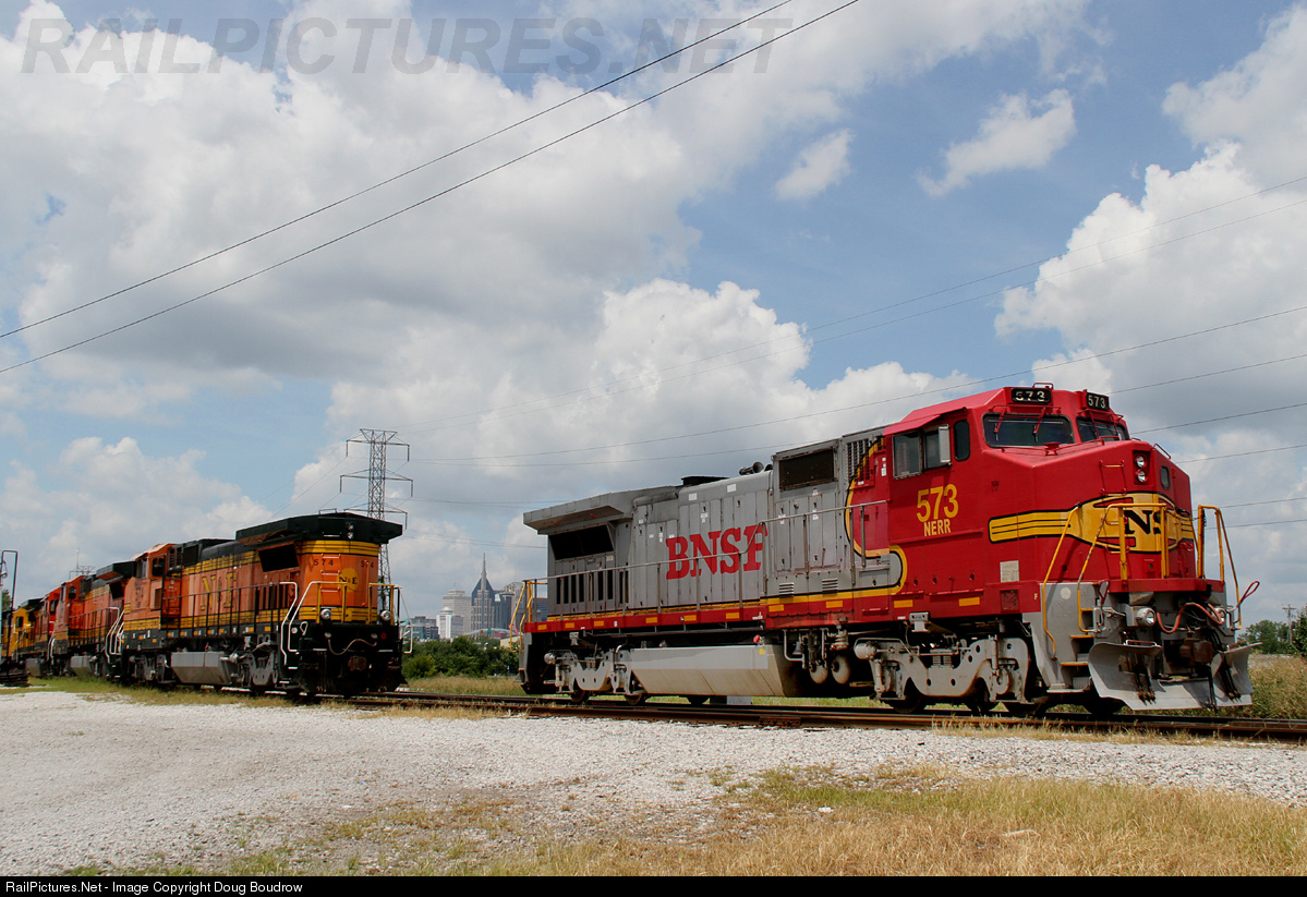 NERR 573, a former BNSF Dash 8 sits idle in the yard on a hot July afternoon. 573 is joined on the NERR by other former BNSF power that sits in the background as the skyline of Music City looks on.