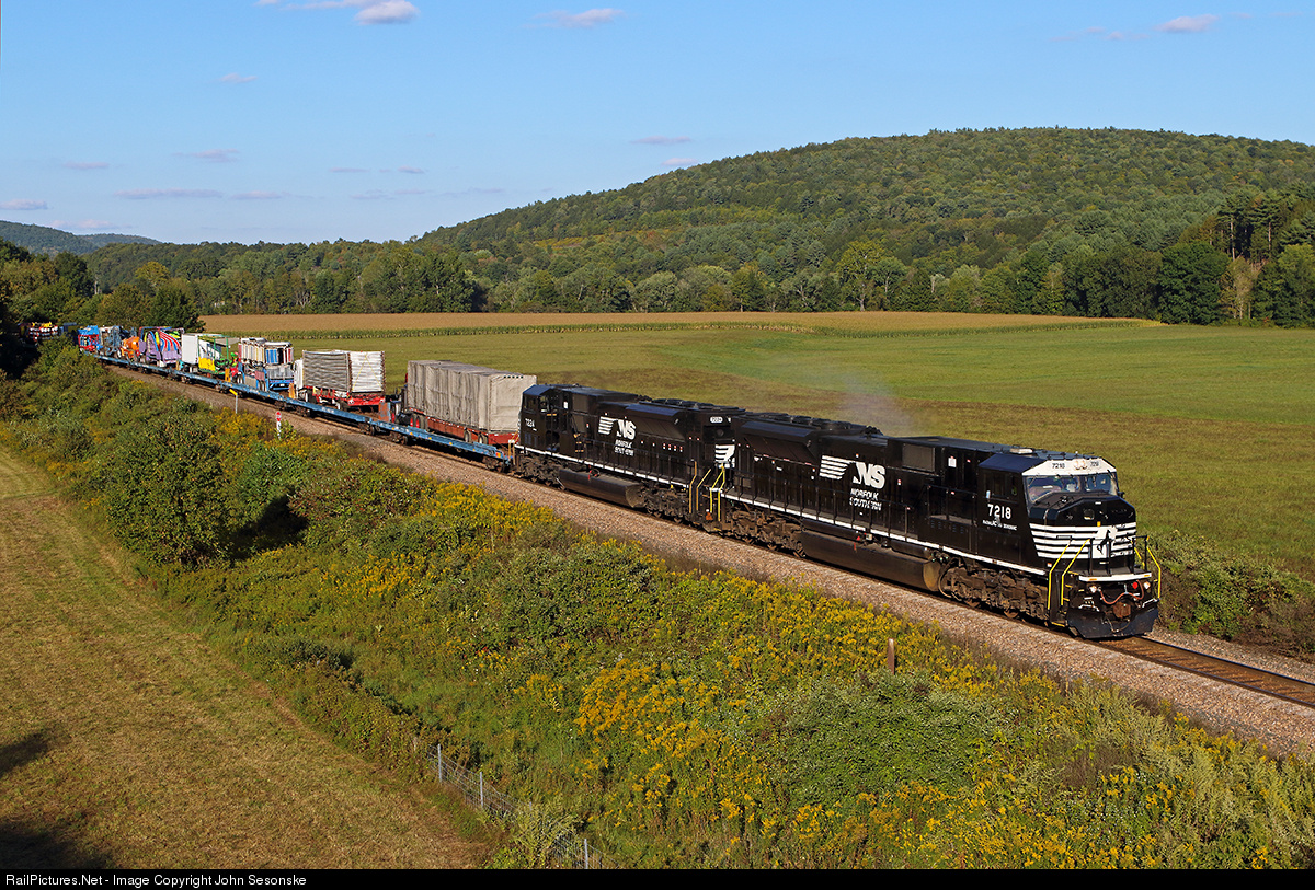 The James E Strates Carnival train heads SB on CP'S D&H lead by two ex Conrail SD80MAC's, NS 7218 and 7224. The train is running as an NS train on the D&H under NS symbol 047. The train is in route from Burlington, VT to Danville, VA via NECR-PAS-NS. The NS 7218 is former CR 4104 and NS 7224 is former CR 4121.