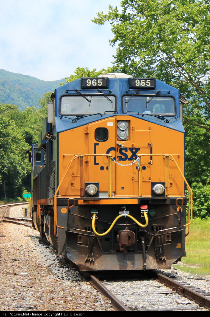 | CSX 965 awaits a new crew as the other pusher crew returning from Watkins ran short of time temporarily parking out in the house track at Cadet yard. A new crew from Loyall,KY is on their way retrieve the locos to assist a loaded Benedict train currently loading in Saint Charles, VA. |