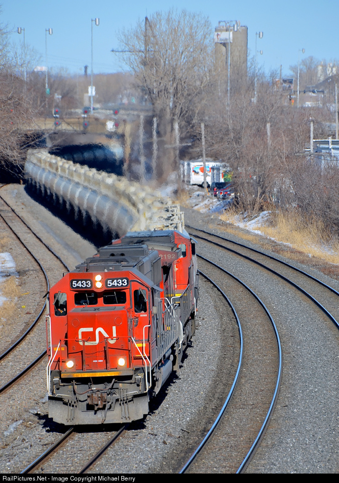 | Ex-Oakway leading. CN 705 has two of CN's secondhand units (ex-Oakway SD60 CN 5433 & ex-BNSF Dash8-40CW CN 2192) as well as some loaded TankTrain cars (destined for Maitland, ON) ahead of the oil empties. Here it heads west through Montreal West after a crew change on a sunny winter afternoon. |