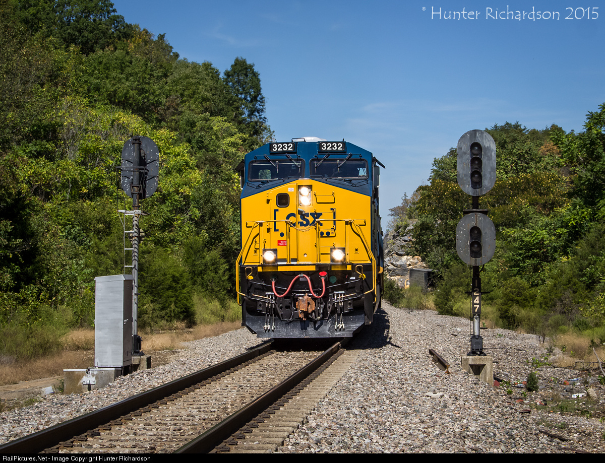 | Grinding hard upgrade on the rails of the former Clinchfield "High Line", CSX 3232 leads a heavy SCWX coal train through the Classic Clinchfield Signals at Quarry; 124.7 miles from Elkhorn City. |
