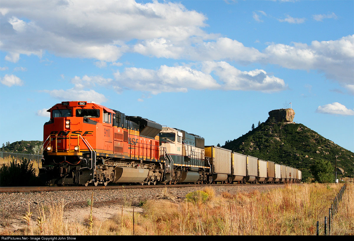 Under a Beautiful late Summer sky, BNSF 9110 heads North with an empty coal train with the landmark rock at Castle Rock in the background.