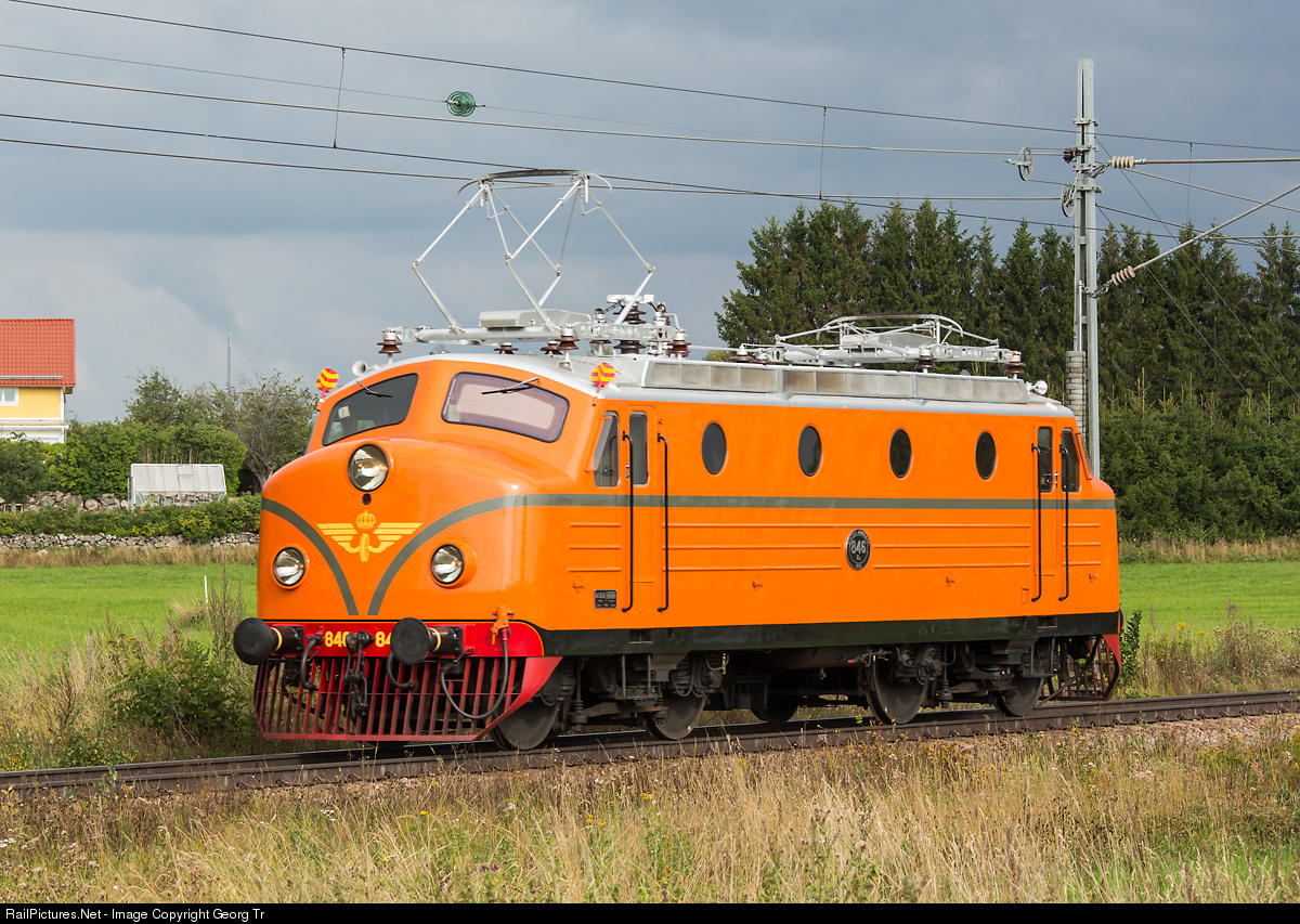 Inspired for the appearance from North America, with round shapes and a bulldog nose, this electric 4 axle express train locomotive was built by ASEA in 1955 for the swedish Statens Järnvägar (SJ), together with sister Ra # 847. In 1961 another 8 Ra # 987-994 were delivered. 2640 kW and capable for 150 km/h, but in regular service with express trains between Stockholm and Gothenburg and Malmö with 130 km/h till the late 1980'. Ra # 846 is in the original paint scheme of the 1950' and operational for the Swedish Railway Museum. She is running light from Gävle via Storvik to Avesta Krylbo, to pull the "City Express" from there to Stockholm in the evening, this on the occasion of 100 years railway electrification in Sweden.