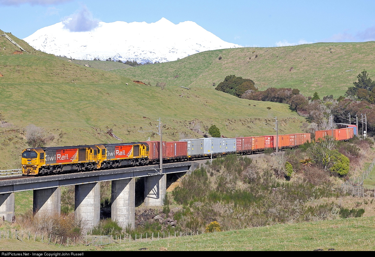 Trains on 3' 6" (1.067m) track from Whangarei to Bluff with virtually heritage rebuilt EMD and GE locomotives still the mainstay power. The network was privatized in 1990's and operated by Toll until 2008 when state owned KiwiRail was established.