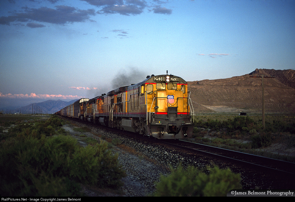 | Just after sundown, the North Platte to Milpitas autos roll west along the old WP in Skull Valley on August 12, 1993. |