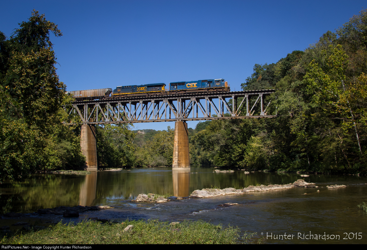 On a crystal clear September afternoon, a veteran SD70MAC leads a southbound grain train across the former Clinchfield Bridge spanning the North Fork of the Holston River.