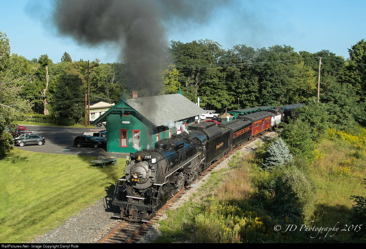 | When I first heard about the trips with 765 to the Water Gap and East Stroudsburg, I knew the one shot I wanted to get was the big Berk passing the former Lackawanna station at Cresco, PA. So here is the NKP Berk fighting a stiff grade and a 10 mph speed restriction passing the nicely restored station area at Cresco, PA. |