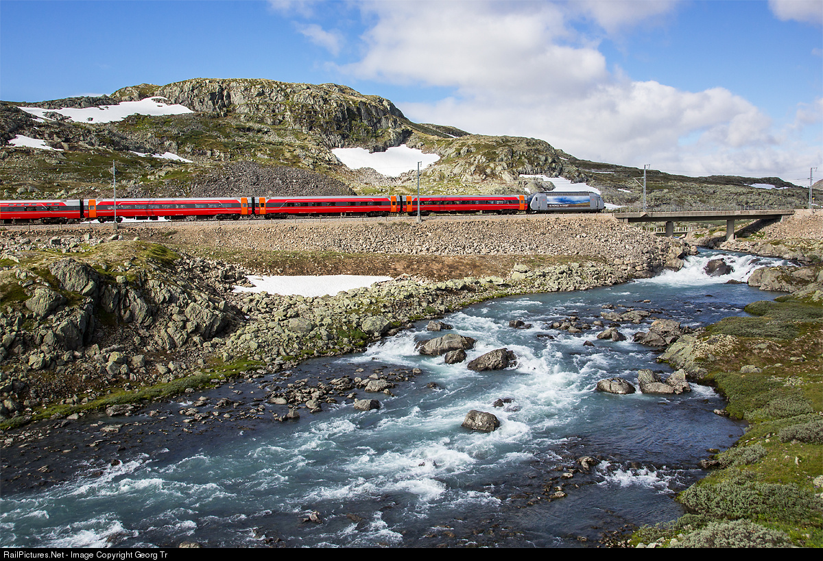 | El 18 # 2248 of the NSB with train 609 from Oslo to Voss in the Hardangervidda between Tunga and Finse, on about 1190 meter a.s.l., running with 160 km/h on this curve stretched section of the line. |