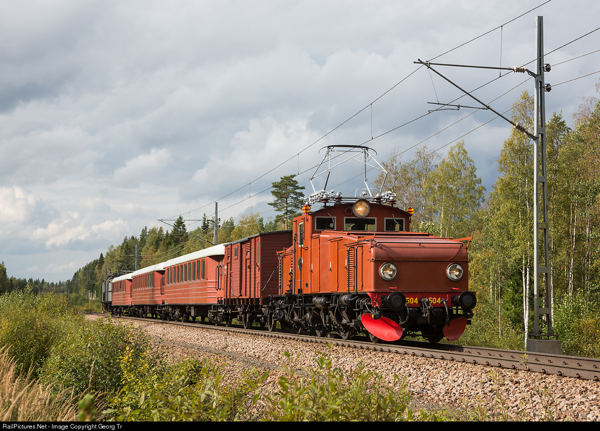 | Hg # 504 of the former Söder Dalarnas Järnväg (SDJ) was built by ASEA in 1947, was with Statens Järnvägar as Hg # 756 from 1948. Withdrawn in 1968 and first with Museiföreningen Gefle-Dala Jernväg, from 1989 operational for the Swedish Railway Museum in Gävle. In the rear of the train 100 years old locomotive Pa 27. |