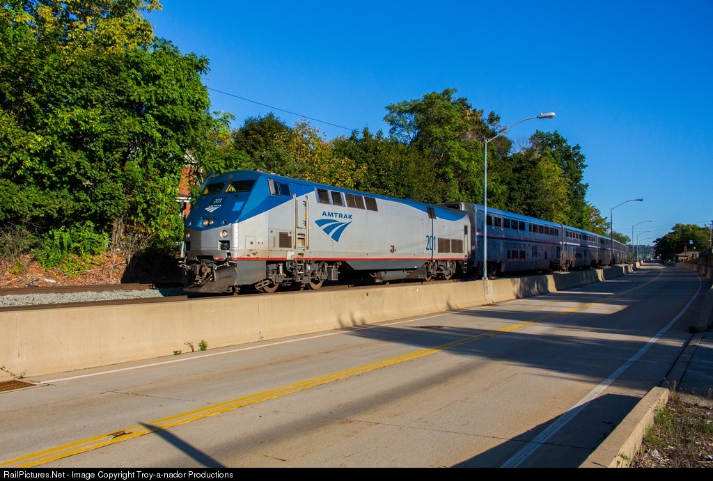 | An Amtrak special runs along the Martin Luther King Jr. Busway as it heads east towards The City of Brotherly Love. You can see the former PRR Edgewood passenger station to the right of the image which was restored and turned into office space. It is definitely a rare sight to see superliners this far down on the Pittsburgh Line and it surely got a lot of people's attention along the way. |