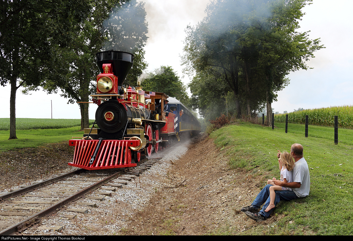 | A farmer and his daughter witness a spectacular show in their own backyard as CPRR #63 labors with four relatively modern passenger cars on the Bluegrass Railroad Museum's former Southern Railway LL-Branch. The hard working American appeals to all of the senses as she barks upgrade in a plume of sand which is all that prevents her drivers from losing traction on the damp rail. |