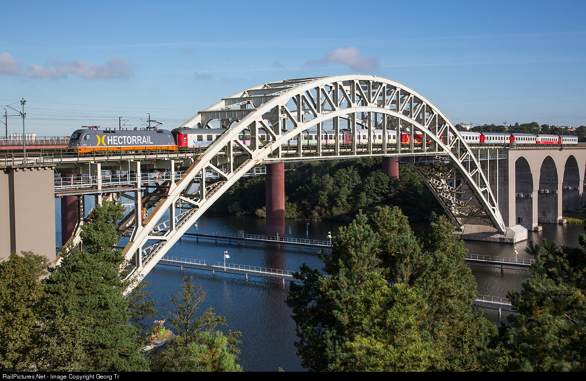 Siemens "Taurus" 242.532 "Lightyear" of Hector Rail is crossing the 532 meter long Årstabron (Årsta bridge) from the isle Södermalm to the south mainland, with Veolia train 3941 "Snälltåget" from Stockholm to Malmö. The bridge, on its completion in 1929 the longest bridge in Sweden, was designed by the architect Cyrillus Johansson (1884–1959) and the engineers Ernst Nilsson (1874–1946) and Salomon Kasarnowsky (1887–1960). It has often been compared to a classical Roman aqueduct, and is today declared a historical landmark.