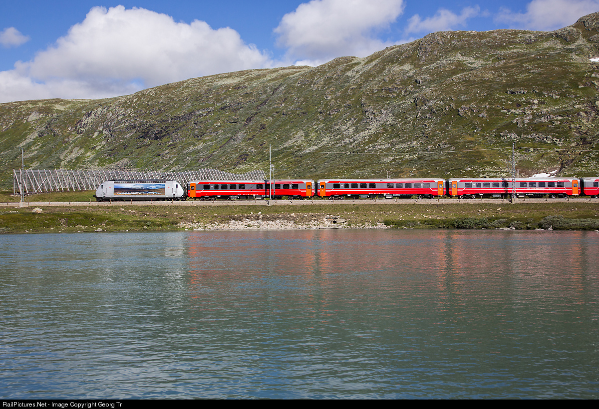 | El 18 # 2243 of the NSB AS (Norges Statsbaner AS) with "Regiontog" (express train) from Oslo to Bergen, between Tunga and Finse on the Hardanngervidda, running with 160 km/h along Hestebotn Lake. The cars are of type/class B5, built by Strømmens Værksted from 1977 to 1981, upgraded by Bombardier 2011/2012. The bogies are of inside frame type. |