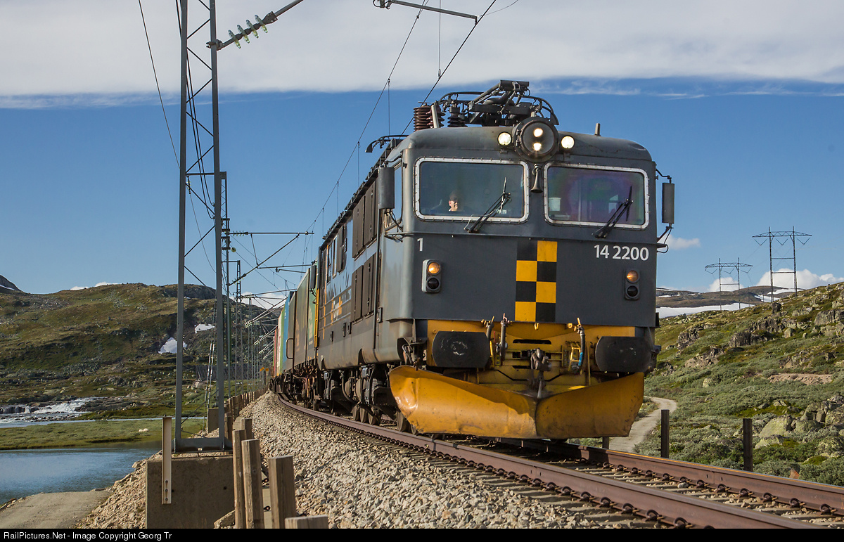 | Sixaxle freight locomotive El 14 # 2200 of CargoNet with train 5504 from Bergen to Oslo Alnabru between Finse and Tunga on the Bergen line. |