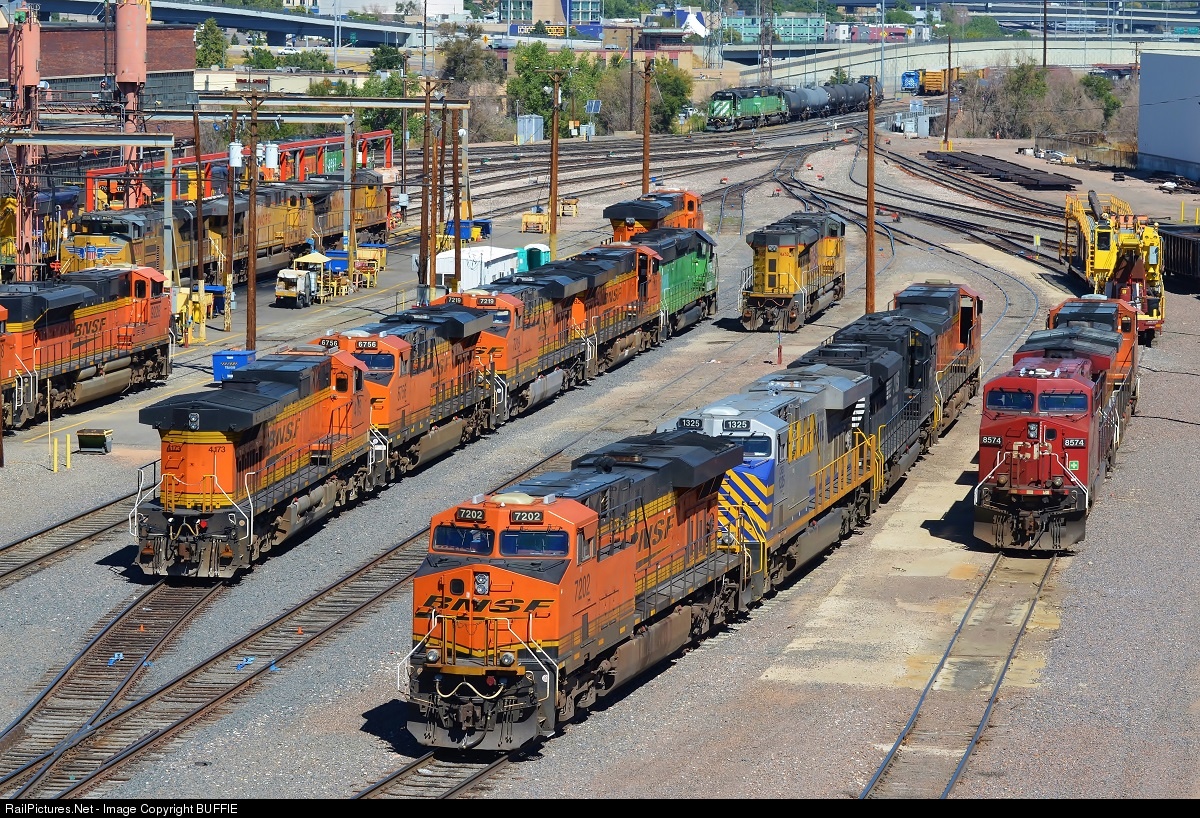 It is an active and colorful day at the BNSF engine servicing facility. Visitors from the Union Pacific, Canadian Pacific, Norfolk Southern and Citirail hold spaces in the yard. You can also spot some former Burlington Northern cascade green units, as well as a couple former Santa Fe Bluebonnets, an Ohio Crane and way in the back, a CEFX unit working the yard.