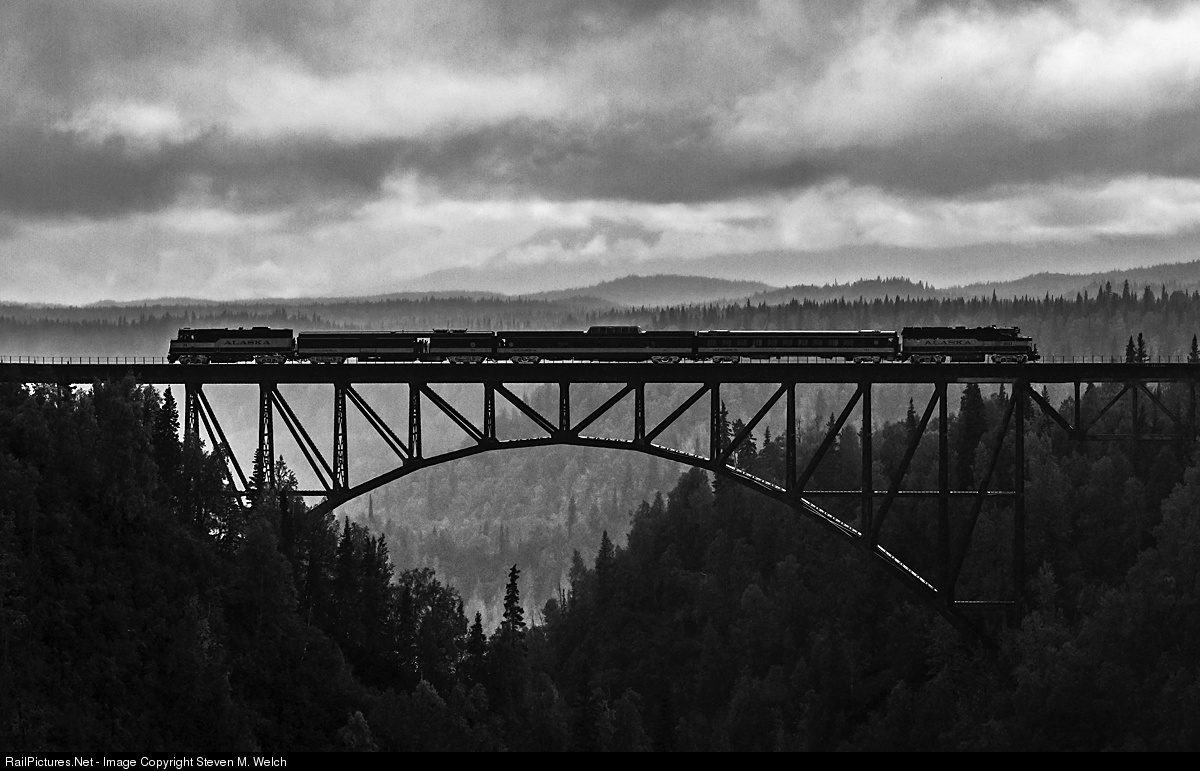 The impressive trestle over the Hurricane Gulch spans 918 ft and rises 296 ft above the floor below. It is the signature location on the entire Alaska Railroad mainline and was the most expensive and difficult engineering project on the entirety of the line. The American Bridge Company started construction in early 1921, erected steel in June and finished in August. To construct the bridge, they strung an aerial tram across the gulch and construction proceeded from both sides. The first passenger train crossed Hurricane Gulch Bridge on August 15, 1921 culminating the $1,200,000 project. While easily the most spectacular point on the mainline between Anchorage and Fairbanks it is rarely photographed except from the train itself.