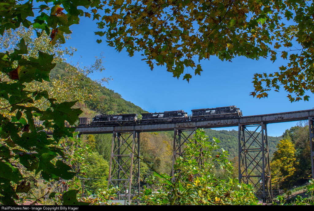 Covel from the trees. Framed through the trees, U86, having left Elmore about 20 minutes prior, passes over the massive trestle at Covel, headed up the 2.2% grade to Clarks Gap. This is the last week of service on this line between Elmore and Princeton, as lack of traffic and maintenance costs have taken their toll.