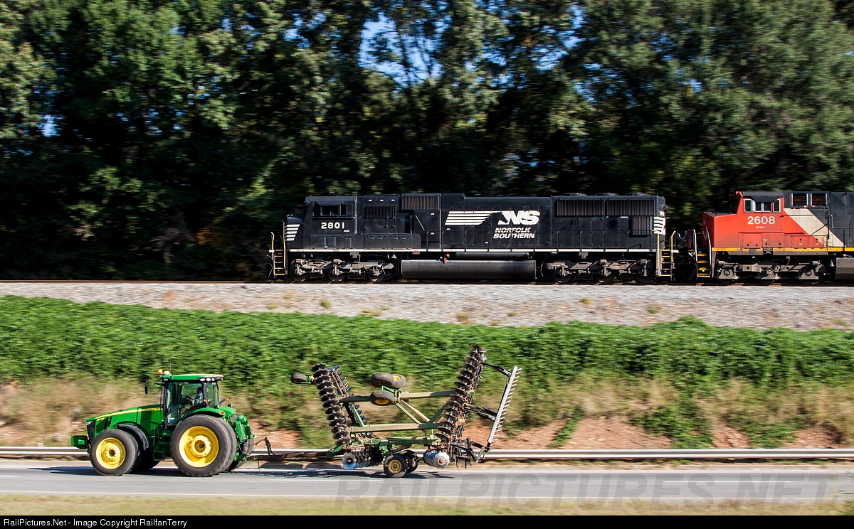 NS #2801 ex Santa Fe SD75M leads a ballast train 93A west bound as it passes the John Deer tractor heading down Hwy 72