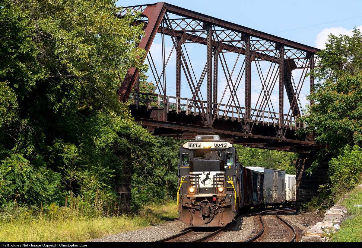 | NS 8845, with a westbound, passes under the bridge which was once Lehigh Valley's Easton & Northern branch. |