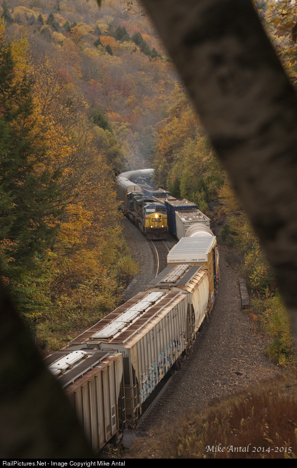 It's just past peak and the occasional gusts have already taken down some of the foliage, but plenty of color still abounds the landscape in Berkshire Hills of Western Massachusetts on this beautiful Fall morning in late October. After making it's presence known for quite some time on it's ascent, westbound merchandise freight Q425 has finally pulled it's train through the reverse curves that pierce the Twin Ledges, slowly winning the battle against gravity and the 1.5% ruling grade that graces the east face of Washington Hill on the old Boston & Albany main through the Berkshires. Q264's autorack loads drop downgrade alongside the Q425, seconds away from crossing over the West Branch of the Westfield River for the 8th (and not final) time on it's descent down the mountain towards Chester and eventually Springfield. Rolling meets on the B&A are not observed too often, and are always a thrilling sight to take in when one happens to be in the right place at the right time and at the right elevation...