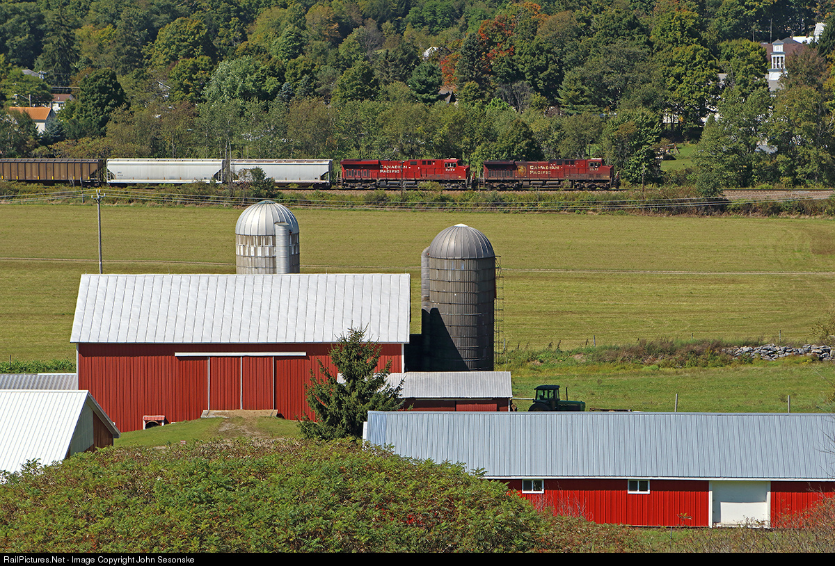 The last Canadian Pacific train heads NB thru upstate NY farmland on the Delaware & Hudson. On 9-19-2015 Norfolk Southern took over the D&H tracks from Schenectady, NY to Sunbury, PA. No longer will a single RR operate between the Canadian border and the Scranton area for the first time since the late 1800's. The last 253 has CP 9623, CP 8954 (ES44AC) and 19 cars after picking up 3 covered hoppers at Oneonta.