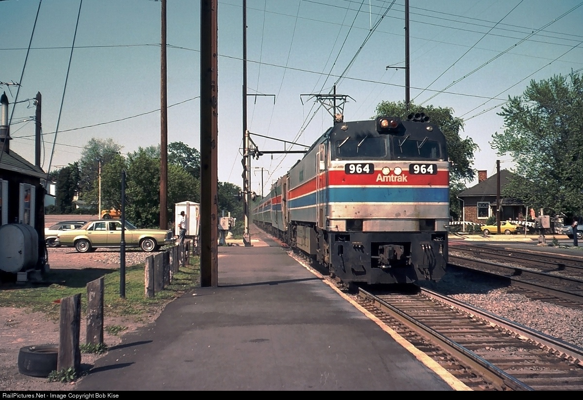 The E-60 that is now preserved at Strasburg is seen in its heyday crossing Bel Air Avenue at high speed on its way to Washington, DC. E-60 operations, the vintage autos, and the 4-lane grade crossing are all long-gone, but the station has been improved, and now has MARC commuter service.