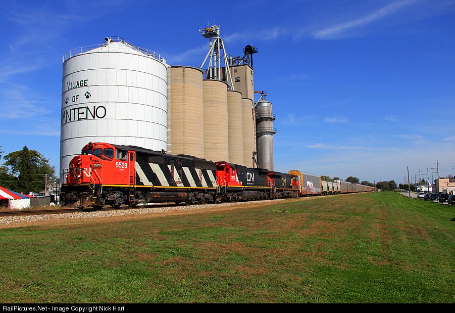 CN SD60F 5529 leads southbound M371 by the grain elevator in Manteno, IL. It's nice to see an SD60F out and about, as a good majority of them are currently in storage.