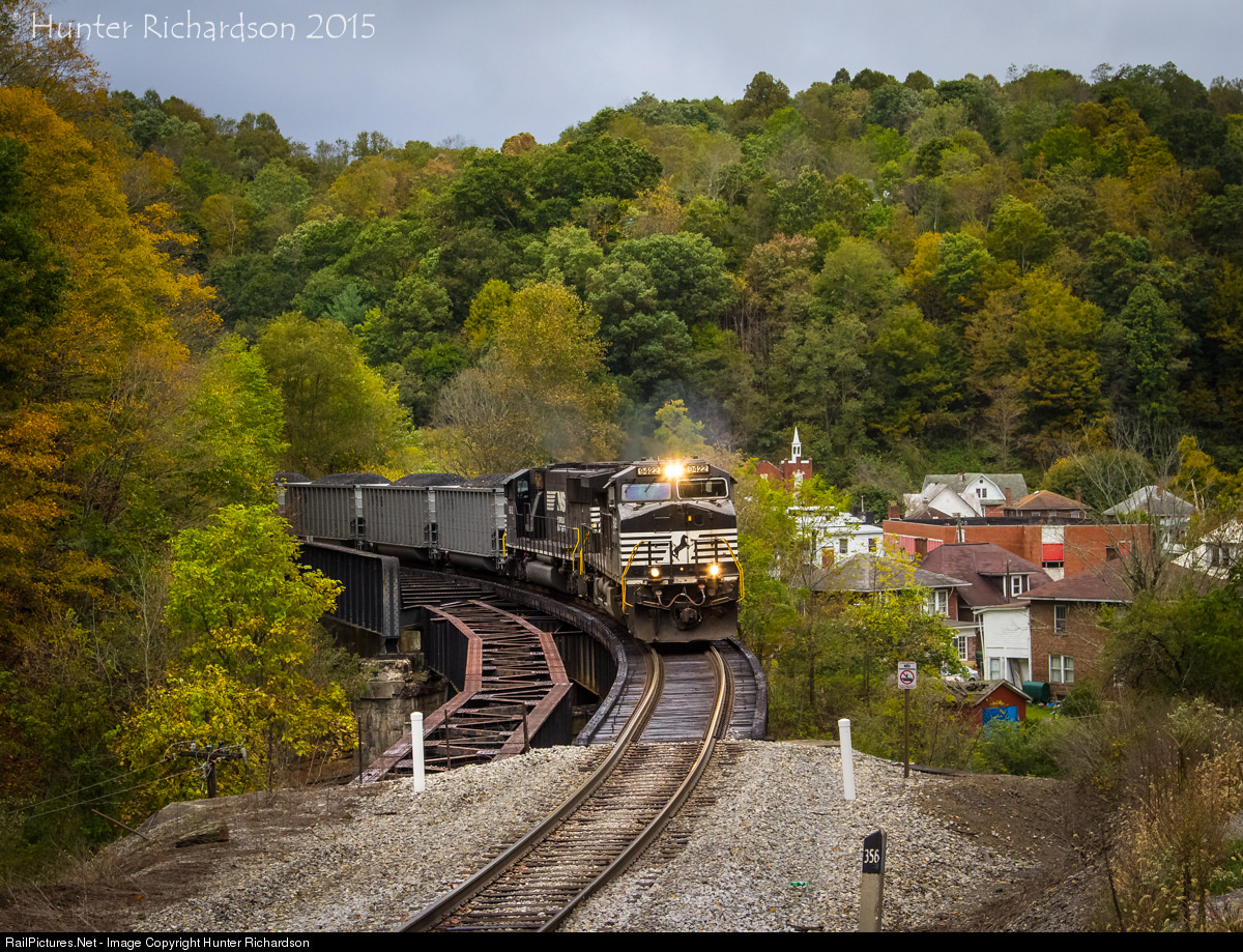 On the former Virginian Railway, an eastbound loaded coal train bound for Princeton has just climbed the steep grade to Clarks Gap. At Clarks Gap, the trains pushers were removed and sent back lite to Elmore, while these two motors are left to lug the heavy drag across a curved trestle in Matoaka, WV in beautiful fall colors.