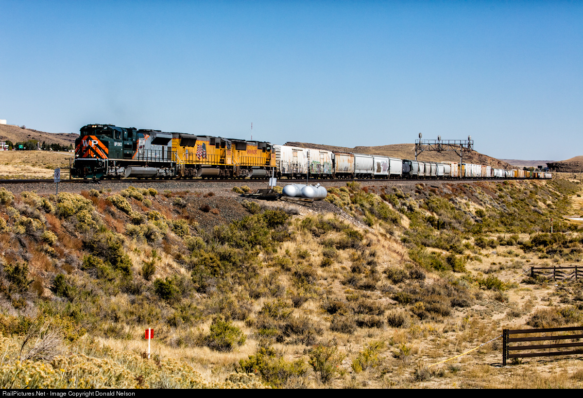 UP 1983 leads a general freight westbound out of Rawlins, heading to Oregon